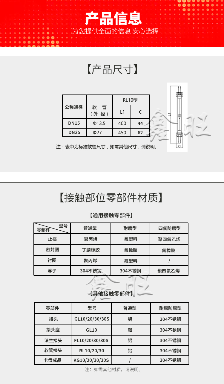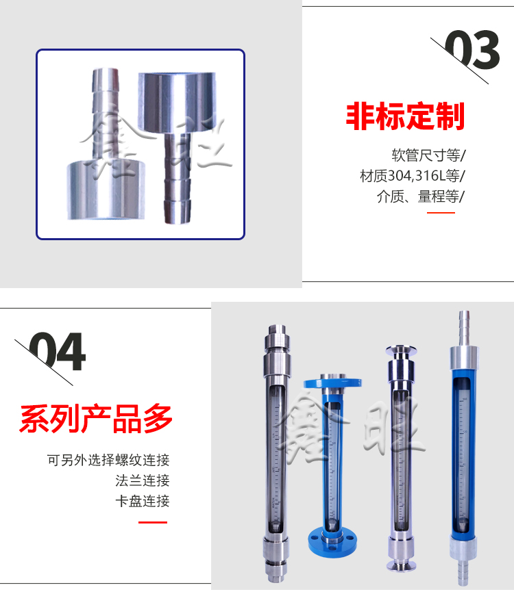 GL/RL/FL10、20、30型玻璃转子流量计的连接有管螺纹(GL10、20、30型)、软管(RL10、20、30型);法兰(FL10、20、30型)三种方式。