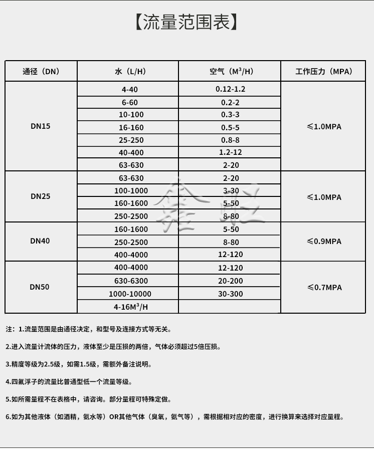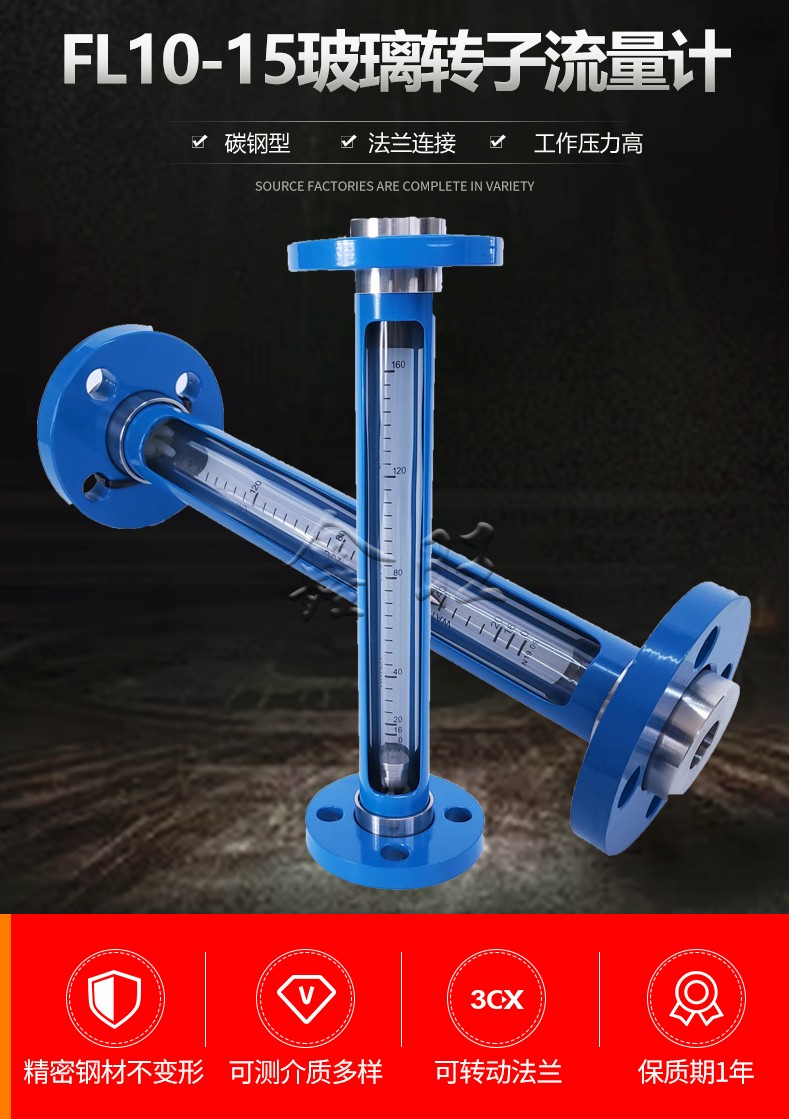 FL10-15玻璃转子流量计的详细信息 FL10-15玻璃转子流量计是一种用于测量封闭管道中液体或气体瞬时流量的仪表。以下是关于该流量计的详细信息: 结构与工作原理 FL10-15玻璃转子流量计主要由一根自下而上扩大的垂直玻璃锥管和一只可随流量大小上下移动的浮子组成。当流体自下而上经过锥管时,流经流量计的流量与浮子上升高度,亦即与流量计的流通面积之间存在着一定的比例关系,浮子的高度位置可作为流量量度。 特点 1. 适用性强:适用于测量封闭管道中各种液体或气体的瞬时流量。 2. 结构简单:安装方便,测量范围灵活,可测微小流量。 3. 多种连接形式:有螺纹连接,法兰连接,小口径DN10口径以下带调节阀,可以有多种连接形式选择,卡套、宝塔等,方便用户。 4. 防腐性能:防腐型(如FL10-15F)可用于测量腐蚀性气体或液体。 5. 精度等级:精度等级为2.5级,如需1.5级,需额外备注说明。 安装与使用 1. 安装前检查:安装前需要将流量计中的顶衬物取出,检查锥管有无破损,浮子能否自由上下移动,确定正常后方可安装。 2. 安装要求:玻璃转子流量计应垂直安装,安装在无振动的管道上,转子流量计的中心线与铅垂线的夹角应不超过5度。大口径流量计由于较重,为避免管道弯曲,必要时可采取加固支撑等措施。 3. 操作步骤:使用时,应先缓慢旋开流量计上游管道上的控制阀门,然后用调节阀调节流量,以免突然开启造成浮子急速上升击损锥管。 应用领域 FL10-15玻璃转子流量计广泛应用于环境工程、化工工程、机电工程等部门,适用于测量无腐蚀性或腐蚀性液体或气体的瞬时流量。 通过以上信息,可以全面了解FL10-15玻璃转子流量计的基本参数、结构与工作原理、特点、安装与使用方法以及应用领域。